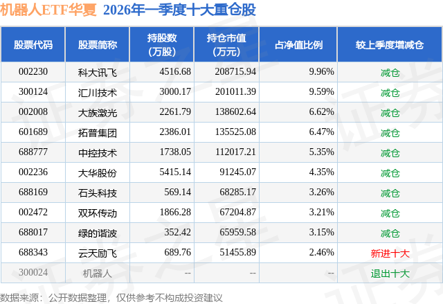 从基金规模来看,机器人ETF华夏基金2026年一季度公布的基金规模为209.52亿元,较上一期规模264.65亿元变化了-55.13亿元,环比变化了-20.83%。该基金最新一期资产配置为:股票占净值比99.79%,无债券类资产,现金占净值比0.26%。从基金持仓来看,该基金当季前十大股票仓位达54.42%,第一大重仓股为科大讯飞(002230),持仓占比为9.96%。