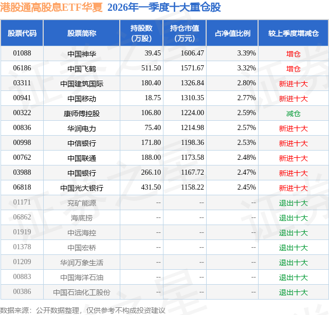 从基金规模来看,港股通高股息ETF华夏基金2026年一季度公布的基金规模为4.73亿元,较上一期规模4.96亿元变化了-2291.95万元,环比变化了-4.62%。该基金最新一期资产配置为:股票占净值比98.01%,无债券类资产,现金占净值比2.06%。从基金持仓来看,该基金当季前十大股票仓位达27.37%,第一大重仓股为中国神华(01088),持仓占比为3.39%。