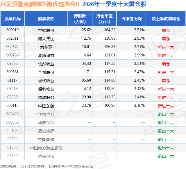 从基金规模来看,兴证资管金麒麟均衡优选混合B基金2026年一季度公布的基金规模为0.1亿元,较上一期规模1876.84万元变化了-926.8万元,环比变化了-49.38%。该基金最新一期资产配置为:股票占净值比87.37%,债券占净值比4.12%,现金占净值比7.62%。从基金持仓来看,该基金当季前十大股票仓位达26.17%,第一大重仓股为宝钢股份(600019),持仓占比为3.51%。
