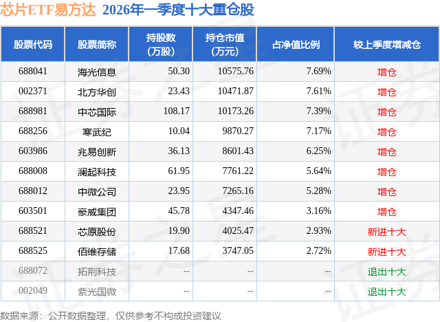 从基金规模来看,芯片ETF易方达基金2026年一季度公布的基金规模为13.76亿元,较上一期规模13.04亿元变化了7191.35万元,环比变化了5.51%。该基金最新一期资产配置为:股票占净值比99.76%,无债券类资产,现金占净值比0.42%。从基金持仓来看,该基金当季前十大股票仓位达55.84%,第一大重仓股为海光信息(688041),持仓占比为7.69%。