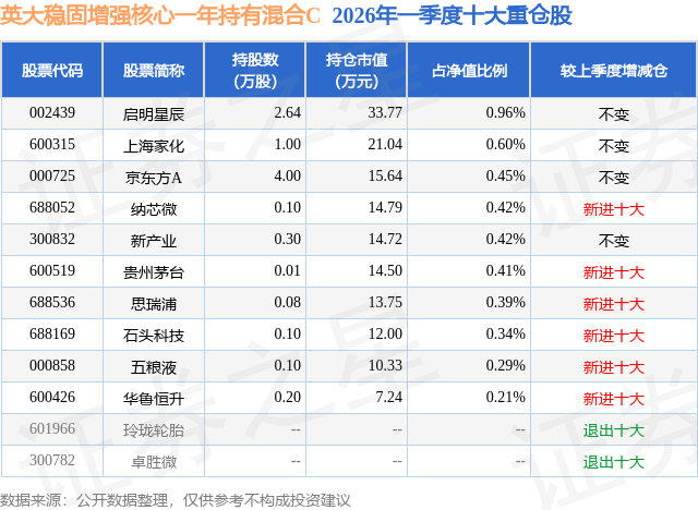 证券之星消息,日前英大稳固增强核心一年持有混合C基金公布一季报,2026年一季度最新规模0.05亿元,季度净值涨幅为-0.12%。
