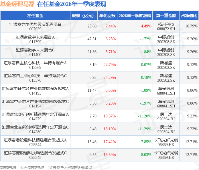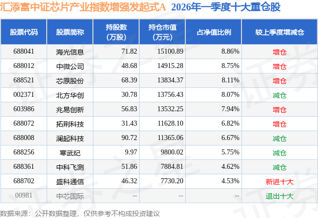 从基金规模来看,汇添富中证芯片产业指数增强发起式A基金2026年一季度公布的基金规模为11.47亿元,较上一期规模7.45亿元变化了4.03亿元,环比变化了54.1%。该基金最新一期资产配置为:股票占净值比93.23%,无债券类资产,现金占净值比7.9%。从基金持仓来看,该基金当季前十大股票仓位达70.12%,第一大重仓股为海光信息(688041),持仓占比为8.86%。