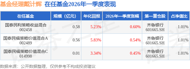 从基金规模来看,国泰民福策略价值混合C基金2026年一季度公布的基金规模为0.01亿元,较上一期规模11.88万元变化了41.98万元,环比变化了353.25%。该基金最新一期资产配置为:股票占净值比23.5%,债券占净值比32.33%,现金占净值比19.15%。从基金持仓来看,该基金当季前十大股票仓位达6.93%,第一大重仓股为齐鲁银行(601665),持仓占比为1.01%。