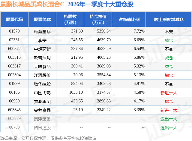 从基金规模来看,景顺长城品质成长混合C基金2026年一季度公布的基金规模为0.02亿元,较上一期规模2949.92万元变化了-2762.87万元,环比变化了-93.66%。该基金最新一期资产配置为:股票占净值比93.21%,债券占净值比4.38%,现金占净值比2.75%。从基金持仓来看,该基金当季前十大股票仓位达54.31%,第一大重仓股为颐海国际(01579),持仓占比为7.72%。