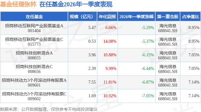 从基金规模来看,招商移动互联网产业股票基金C基金2026年一季度公布的基金规模为0.53亿元,较上一期规模2.07亿元变化了-1.53亿元,环比变化了-74.15%。该基金最新一期资产配置为:股票占净值比81.88%,债券占净值比5.68%,现金占净值比9.18%。从基金持仓来看,该基金当季前十大股票仓位达59.31%,第一大重仓股为海光信息(688041),持仓占比为8.95%。