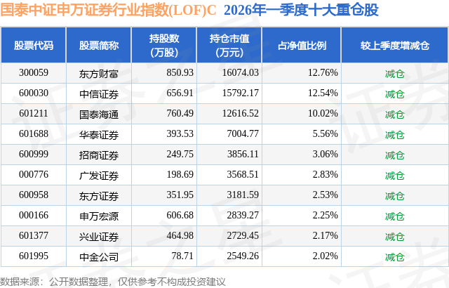 从基金规模来看,国泰中证申万证券行业指数(LOF)C基金2026年一季度公布的基金规模为1.86亿元,较上一期规模1.43亿元变化了4349.9万元,环比变化了30.52%。该基金最新一期资产配置为:股票占净值比94.35%,债券占净值比0.76%,现金占净值比5.29%。从基金持仓来看,该基金当季前十大股票仓位达55.74%,第一大重仓股为东方财富(300059),持仓占比为12.76%。