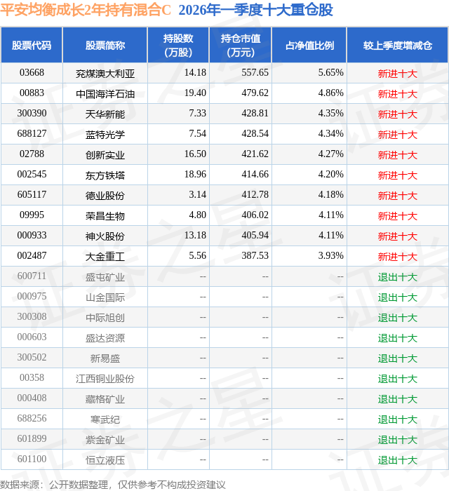 从基金规模来看,平安均衡成长2年持有混合C基金2026年一季度公布的基金规模为0.07亿元,较上一期规模685.59万元变化了-23.35万元,环比变化了-3.41%。该基金最新一期资产配置为:股票占净值比92.28%,无债券类资产,现金占净值比17.16%。从基金持仓来看,该基金当季前十大股票仓位达44.0%,第一大重仓股为兖煤澳大利亚(03668),持仓占比为5.65%。