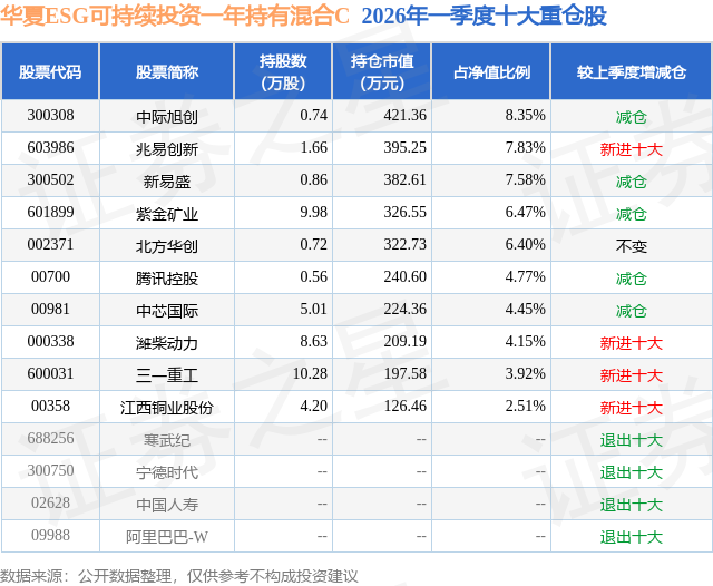 从基金规模来看,华夏ESG可持续投资一年持有混合C基金2026年一季度公布的基金规模为0.03亿元,较上一期规模586.77万元变化了-260.13万元,环比变化了-44.33%。该基金最新一期资产配置为:股票占净值比92.18%,无债券类资产,现金占净值比9.25%。从基金持仓来看,该基金当季前十大股票仓位达56.43%,第一大重仓股为中际旭创(300308),持仓占比为8.35%。