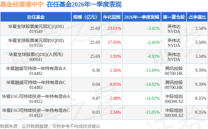 证券之星消息,日前华夏ESG可持续投资一年持有混合C基金公布一季报,2026年一季度最新规模0.03亿元,季度净值涨幅为-15.05%。