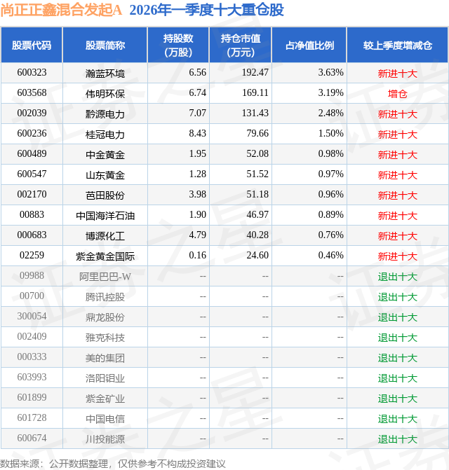从基金规模来看,尚正正鑫混合发起A基金2026年一季度公布的基金规模为0.52亿元,较上一期规模8483.3万元变化了-3304.88万元,环比变化了-38.96%。该基金最新一期资产配置为:股票占净值比15.91%,债券占净值比46.63%,现金占净值比0.91%。从基金持仓来看,该基金当季前十大股票仓位达15.82%,第一大重仓股为瀚蓝环境(600323),持仓占比为3.63%。