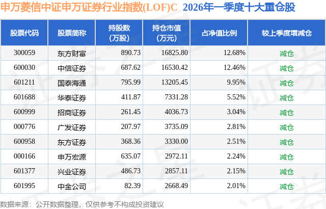 从基金规模来看,申万菱信中证申万证券行业指数(LOF)C基金2026年一季度公布的基金规模为0.71亿元,较上一期规模1.34亿元变化了-6259.34万元,环比变化了-46.81%。该基金最新一期资产配置为:股票占净值比93.81%,无债券类资产,现金占净值比6.31%。从基金持仓来看,该基金当季前十大股票仓位达55.37%,第一大重仓股为东方财富(300059),持仓占比为12.68%。