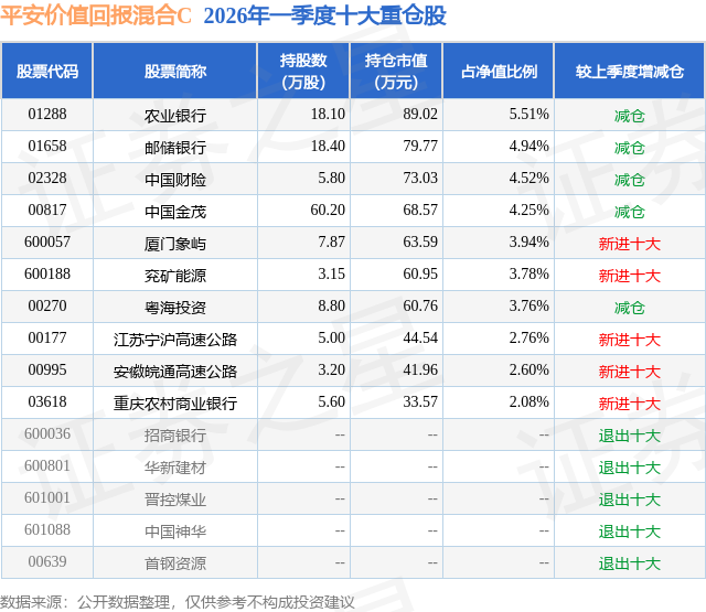 从基金规模来看,平安价值回报混合C基金2026年一季度公布的基金规模为0.02亿元,较上一期规模447.25万元变化了-268.94万元,环比变化了-60.13%。该基金最新一期资产配置为:股票占净值比93.1%,债券占净值比2.51%,现金占净值比3.55%。从基金持仓来看,该基金当季前十大股票仓位达38.14%,第一大重仓股为农业银行(01288),持仓占比为5.51%。