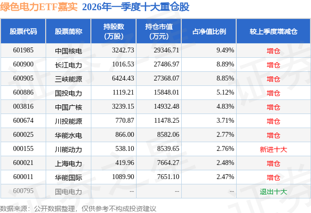从基金规模来看,绿色电力ETF嘉实基金2026年一季度公布的基金规模为30.94亿元,较上一期规模13.8亿元变化了17.14亿元,环比变化了124.18%。该基金最新一期资产配置为:股票占净值比99.39%,无债券类资产,现金占净值比1.08%。从基金持仓来看,该基金当季前十大股票仓位达51.37%,第一大重仓股为中国核电(601985),持仓占比为9.49%。