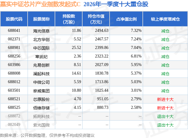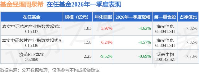 证券之星消息,日前嘉实中证芯片产业指数发起式C基金公布一季报,2026年一季度最新规模1.83亿元,季度净值涨幅为-4.62%。