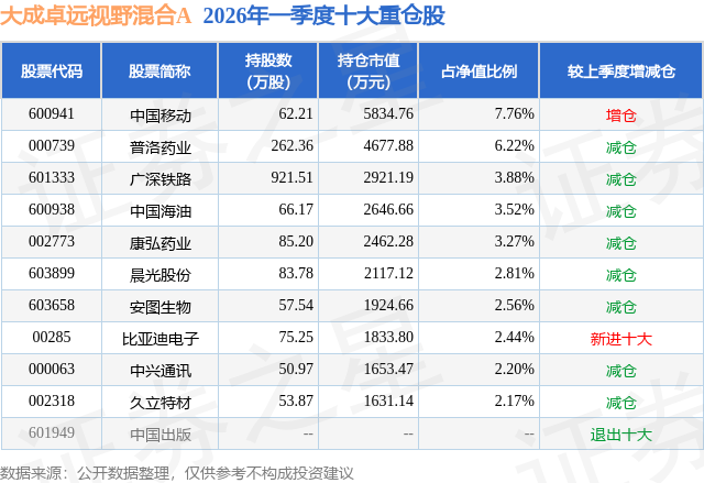 从基金规模来看,大成卓远视野混合A基金2026年一季度公布的基金规模为4.9亿元,较上一期规模3.64亿元变化了1.26亿元,环比变化了34.65%。该基金最新一期资产配置为:股票占净值比59.92%,债券占净值比1.35%,现金占净值比39.53%。从基金持仓来看,该基金当季前十大股票仓位达36.83%,第一大重仓股为中国移动(600941),持仓占比为7.76%。