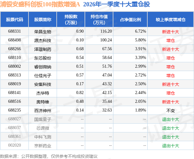 从基金规模来看,浦银安盛科创板100指数增强A基金2026年一季度公布的基金规模为0.08亿元,较上一期规模1957.04万元变化了-1195.46万元,环比变化了-61.09%。该基金最新一期资产配置为:股票占净值比93.66%,无债券类资产,现金占净值比14.82%。从基金持仓来看,该基金当季前十大股票仓位达34.41%,第一大重仓股为荣昌生物(688331),持仓占比为6.72%。
