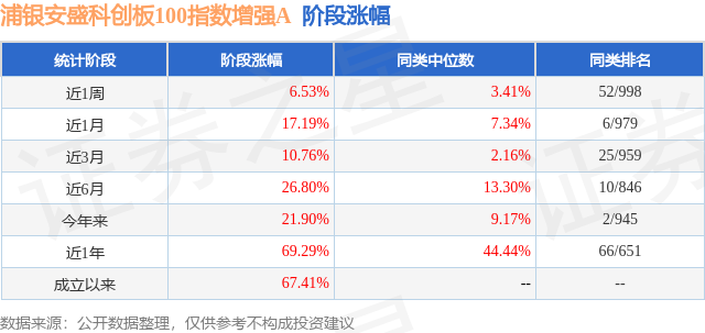 从业绩表现来看,浦银安盛科创板100指数增强A基金过去一年净值涨幅为69.29%,在同类基金中排名66/651,同类基金过去一年净值涨幅中位数为44.44%。而基金过去一年的最大回撤为-13.36%,成立以来的最大回撤为-18.44%。