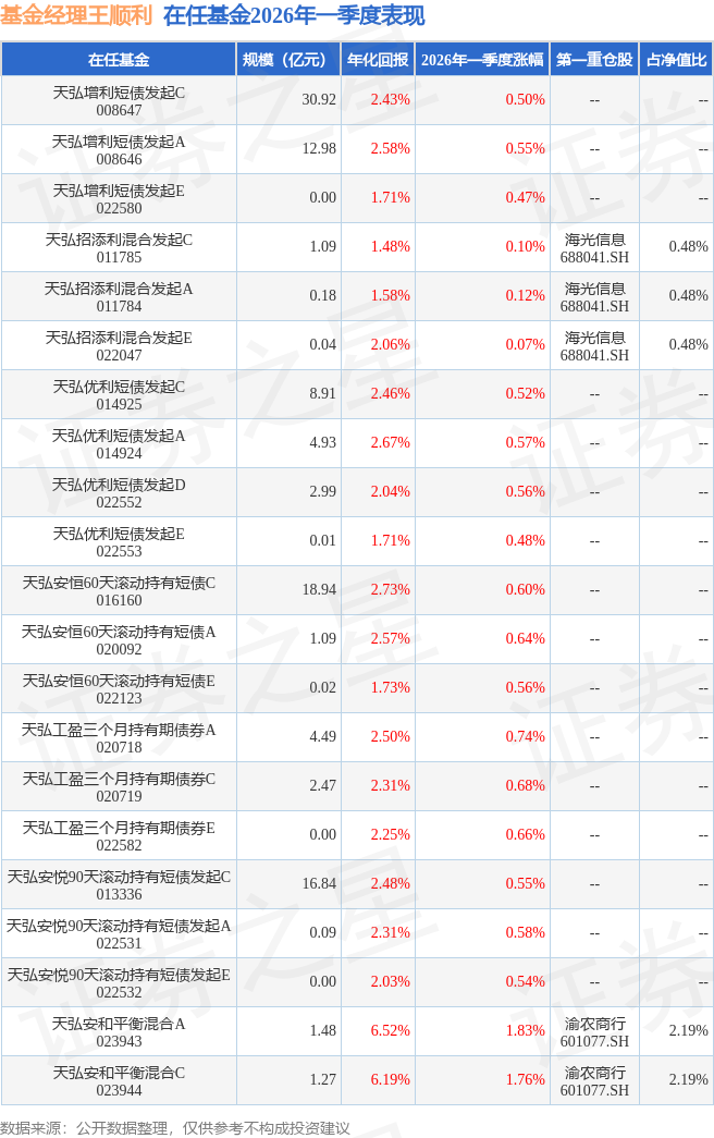 证券之星消息,日前天弘招添利混合发起E基金公布一季报,2026年一季度最新规模0.04亿元,季度净值涨幅为0.07%。