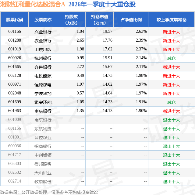 从基金规模来看,湘财红利量化选股混合A基金2026年一季度公布的基金规模为0.06亿元,较上一期规模1148.96万元变化了-539.67万元,环比变化了-46.97%。该基金最新一期资产配置为:股票占净值比76.83%,债券占净值比4.09%,现金占净值比5.13%。从基金持仓来看,该基金当季前十大股票仓位达21.37%,第一大重仓股为兴业银行(601166),持仓占比为2.63%。
