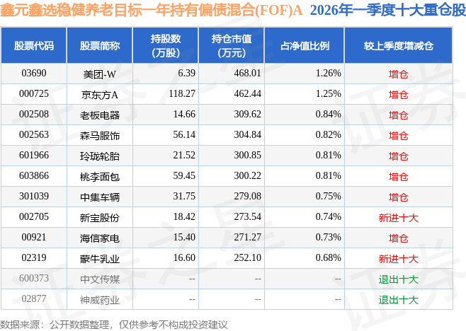 从基金规模来看,鑫元鑫选稳健养老目标一年持有偏债混合(FOF)A基金2026年一季度公布的基金规模为3.7亿元,较上一期规模2.14亿元变化了1.57亿元,环比变化了73.51%。该基金最新一期资产配置为:股票占净值比13.98%,债券占净值比5.32%,现金占净值比0.29%。从基金持仓来看,该基金当季前十大股票仓位达8.69%,第一大重仓股为美团-W(03690),持仓占比为1.26%。