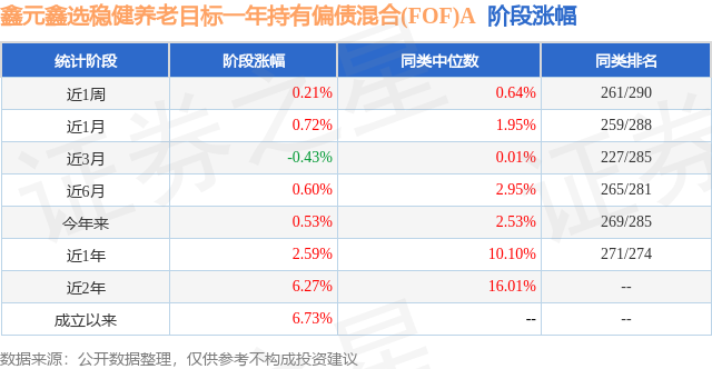 证券之星消息,日前鑫元鑫选稳健养老目标一年持有偏债混合(FOF)A基金公布一季报,2026年一季度最新规模3.7亿元,季度净值涨幅为-0.12%。