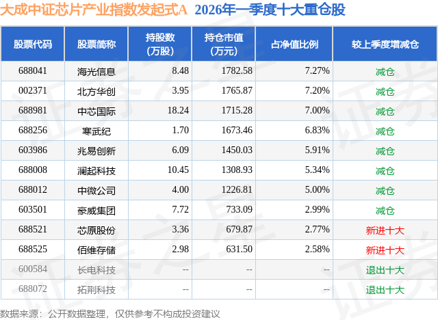 从基金规模来看,大成中证芯片产业指数发起式A基金2026年一季度公布的基金规模为0.69亿元,较上一期规模5796.04万元变化了1075.45万元,环比变化了18.55%。该基金最新一期资产配置为:股票占净值比94.49%,无债券类资产,现金占净值比5.7%。从基金持仓来看,该基金当季前十大股票仓位达52.89%,第一大重仓股为海光信息(688041),持仓占比为7.27%。
