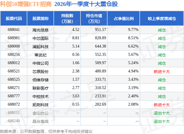 从基金规模来看,科创50增强ETF招商基金2026年一季度公布的基金规模为0.97亿元,较上一期规模1.2亿元变化了-2304.7万元,环比变化了-19.14%。该基金最新一期资产配置为:股票占净值比99.56%,无债券类资产,现金占净值比0.55%。从基金持仓来看,该基金当季前十大股票仓位达51.85%,第一大重仓股为海光信息(688041),持仓占比为9.77%。