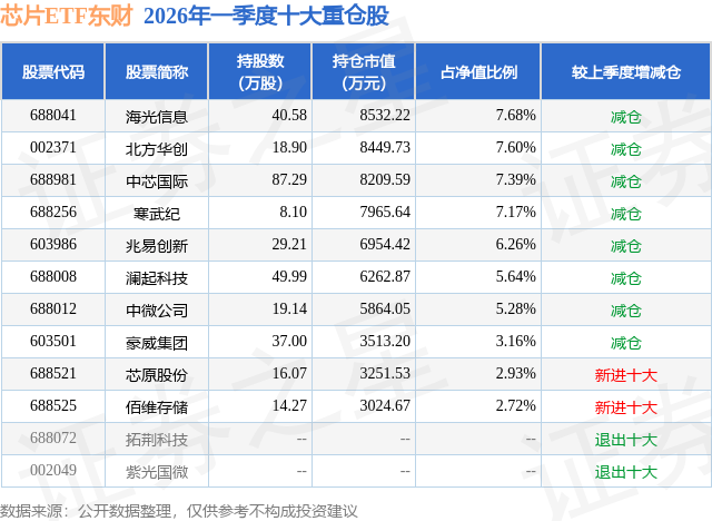 从基金规模来看,芯片ETF东财基金2026年一季度公布的基金规模为11.11亿元,较上一期规模11.9亿元变化了-7856.05万元,环比变化了-6.6%。该基金最新一期资产配置为:股票占净值比99.56%,无债券类资产,现金占净值比1.18%。从基金持仓来看,该基金当季前十大股票仓位达55.83%,第一大重仓股为海光信息(688041),持仓占比为7.68%。