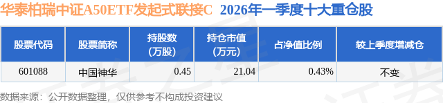 从基金规模来看,华泰柏瑞中证A50ETF发起式联接C基金2026年一季度公布的基金规模为0.25亿元,较上一期规模6270.26万元变化了-3809.73万元,环比变化了-60.76%。该基金最新一期资产配置为:股票占净值比0.43%,债券占净值比3.75%,现金占净值比2.03%。从基金持仓来看,该基金当季前十大股票仓位达0.43%,第一大重仓股为中国神华(601088),持仓占比为0.43%。