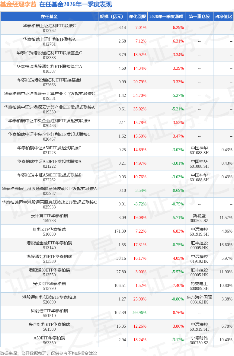 证券之星消息,日前华泰柏瑞中证A50ETF发起式联接A基金公布一季报,2026年一季度最新规模0.21亿元,季度净值涨幅为-3.01%。
