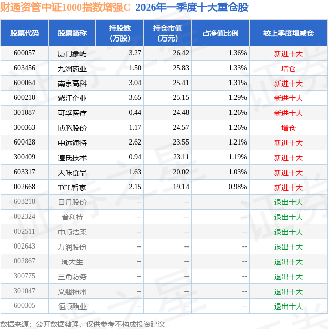 从基金规模来看,财通资管中证1000指数增强C基金2026年一季度公布的基金规模为0.09亿元,较上一期规模109.62万元变化了795.73万元,环比变化了725.87%。该基金最新一期资产配置为:股票占净值比91.5%,无债券类资产,现金占净值比7.88%。从基金持仓来看,该基金当季前十大股票仓位达12.22%,第一大重仓股为厦门象屿(600057),持仓占比为1.36%。