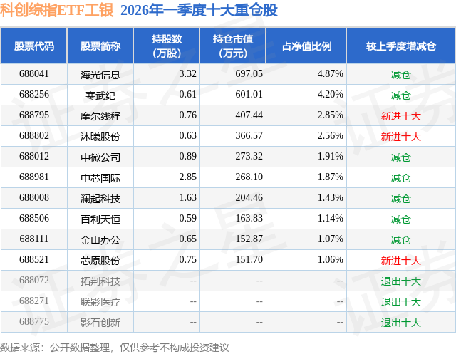 从基金规模来看,科创综指ETF工银基金2026年一季度公布的基金规模为1.43亿元,较上一期规模1.84亿元变化了-4115.25万元,环比变化了-22.34%。该基金最新一期资产配置为:股票占净值比99.01%,无债券类资产,现金占净值比1.14%。从基金持仓来看,该基金当季前十大股票仓位达22.96%,第一大重仓股为海光信息(688041),持仓占比为4.87%。