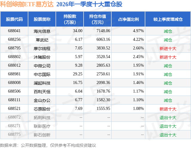 从基金规模来看,科创综指ETF易方达基金2026年一季度公布的基金规模为14.37亿元,较上一期规模16.01亿元变化了-1.64亿元,环比变化了-10.23%。该基金最新一期资产配置为:股票占净值比99.76%,无债券类资产,现金占净值比0.36%。从基金持仓来看,该基金当季前十大股票仓位达22.97%,第一大重仓股为海光信息(688041),持仓占比为4.97%。