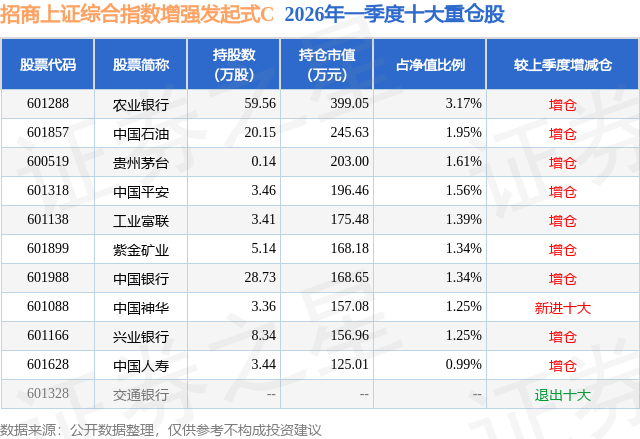 从基金规模来看,招商上证综合指数增强发起式C基金2026年一季度公布的基金规模为0.89亿元。该基金最新一期资产配置为:股票占净值比88.16%,债券占净值比0.64%,现金占净值比10.52%。从基金持仓来看,该基金当季前十大股票仓位达15.85%,第一大重仓股为农业银行(601288),持仓占比为3.17%。