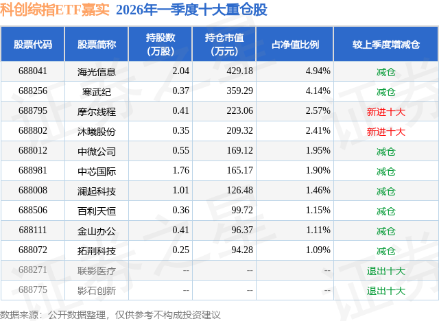 从基金规模来看,科创综指ETF嘉实基金2026年一季度公布的基金规模为0.87亿元,较上一期规模1.11亿元变化了-2371.72万元,环比变化了-21.46%。该基金最新一期资产配置为:股票占净值比99.09%,无债券类资产,现金占净值比0.98%。从基金持仓来看,该基金当季前十大股票仓位达22.72%,第一大重仓股为海光信息(688041),持仓占比为4.94%。