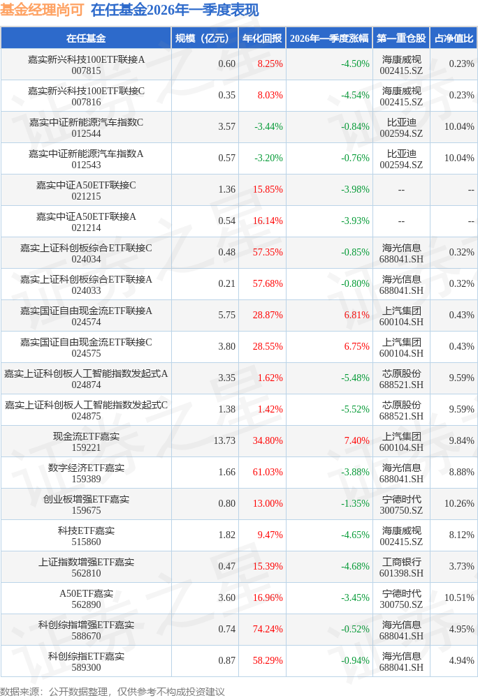 证券之星消息,日前科创综指ETF嘉实基金公布一季报,2026年一季度最新规模0.87亿元,季度净值涨幅为-0.94%。
