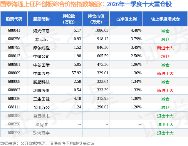 从基金规模来看,国泰海通上证科创板综合价格指数增强C基金2026年一季度公布的基金规模为1.42亿元。该基金最新一期资产配置为:股票占净值比92.72%,无债券类资产,现金占净值比8.06%。从基金持仓来看,该基金当季前十大股票仓位达22.75%,第一大重仓股为海光信息(688041),持仓占比为4.48%。