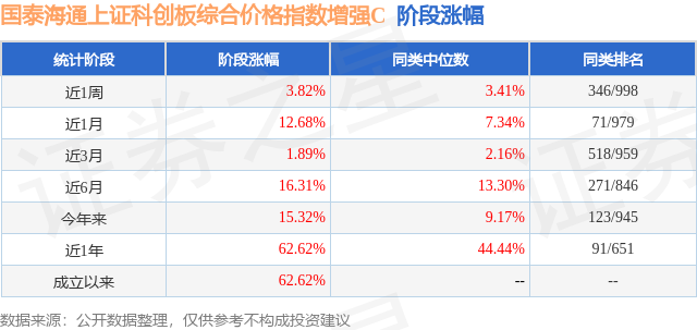 从业绩表现来看,国泰海通上证科创板综合价格指数增强C基金过去一年净值涨幅为62.62%,在同类基金中排名91/651,同类基金过去一年净值涨幅中位数为44.44%。而基金过去一年的最大回撤为-15.35%,成立以来的最大回撤为-15.35%。