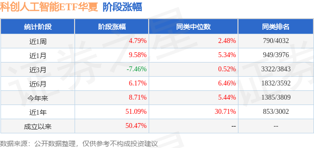 从业绩表现来看,科创人工智能ETF华夏基金过去一年净值涨幅为51.09%,在同类基金中排名853/3002,同类基金过去一年净值涨幅中位数为30.71%。而基金过去一年的最大回撤为-22.15%,成立以来的最大回撤为-22.15%。