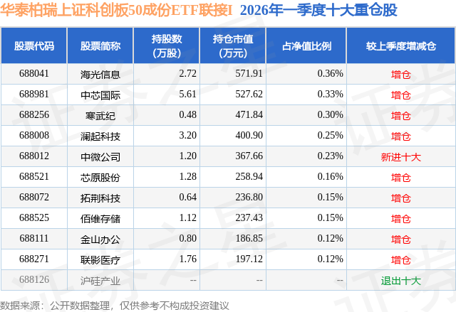 证券之星消息,日前华泰柏瑞上证科创板50成份ETF联接I基金公布一季报,2026年一季度最新规模0.07亿元,季度净值涨幅为-6.4%。