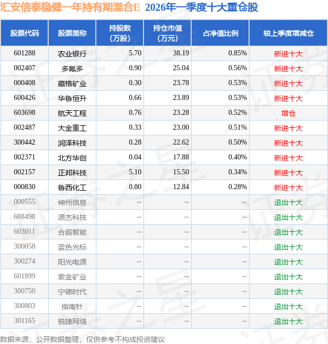 从基金规模来看,汇安信泰稳健一年持有期混合E基金2026年一季度公布的基金规模为0.0亿元,较上一期规模0.4万元变化了-0.0万元,环比变化了-0.94%。该基金最新一期资产配置为:股票占净值比7.41%,债券占净值比93.64%,现金占净值比9.51%。从基金持仓来看,该基金当季前十大股票仓位达5.02%,第一大重仓股为农业银行(601288),持仓占比为0.85%。
