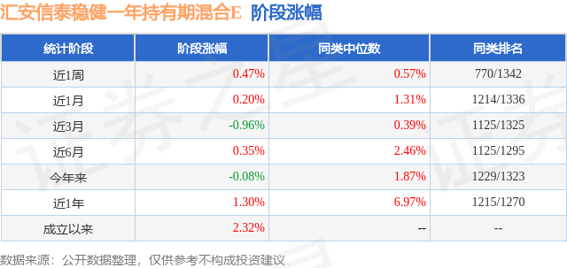 从业绩表现来看,汇安信泰稳健一年持有期混合E基金过去一年净值涨幅为1.3%,在同类基金中排名1215/1270,同类基金过去一年净值涨幅中位数为6.97%。而基金过去一年的最大回撤为-1.97%,成立以来的最大回撤为-1.97%。