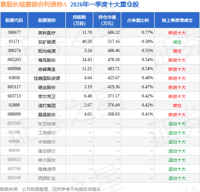 从基金规模来看,景顺长城景颐合利债券A基金2026年一季度公布的基金规模为6.28亿元,较上一期规模7.1亿元变化了-8243.55万元,环比变化了-11.61%。该基金最新一期资产配置为:股票占净值比10.62%,债券占净值比83.15%,现金占净值比0.73%。从基金持仓来看,该基金当季前十大股票仓位达5.18%,第一大重仓股为英科医疗(300677),持仓占比为0.77%。