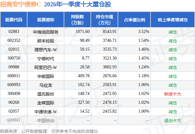 从基金规模来看,招商安宁债券C基金2026年一季度公布的基金规模为8.14亿元,较上一期规模12.28亿元变化了-4.14亿元,环比变化了-33.73%。该基金最新一期资产配置为:股票占净值比19.96%,债券占净值比87.9%,现金占净值比0.92%。从基金持仓来看,该基金当季前十大股票仓位达14.49%,第一大重仓股为中海油田服务(02883),持仓占比为3.52%。