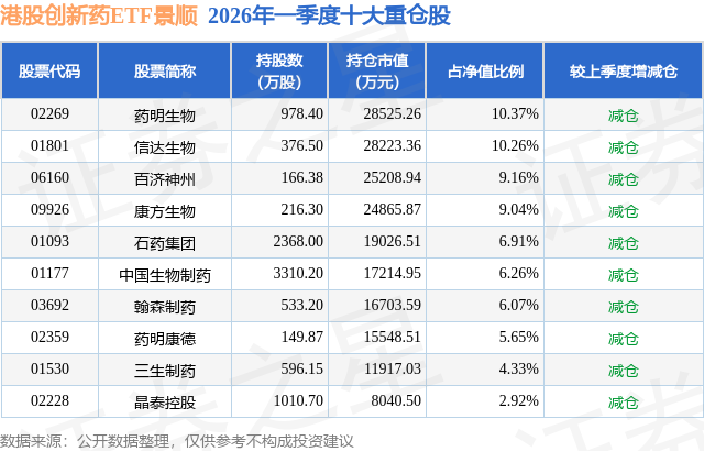 从基金规模来看,港股创新药ETF景顺基金2026年一季度公布的基金规模为27.52亿元,较上一期规模28.83亿元变化了-1.31亿元,环比变化了-4.55%。该基金最新一期资产配置为:股票占净值比99.15%,无债券类资产,现金占净值比0.94%。从基金持仓来看,该基金当季前十大股票仓位达70.97%,第一大重仓股为药明生物(02269),持仓占比为10.37%。