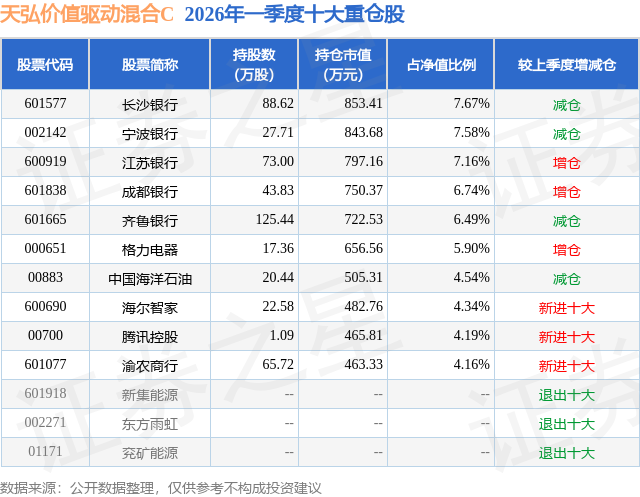从基金规模来看,天弘价值驱动混合C基金2026年一季度公布的基金规模为0.41亿元。该基金最新一期资产配置为:股票占净值比94.99%,债券占净值比11.6%,现金占净值比1.95%。从基金持仓来看,该基金当季前十大股票仓位达58.77%,第一大重仓股为长沙银行(601577),持仓占比为7.67%。