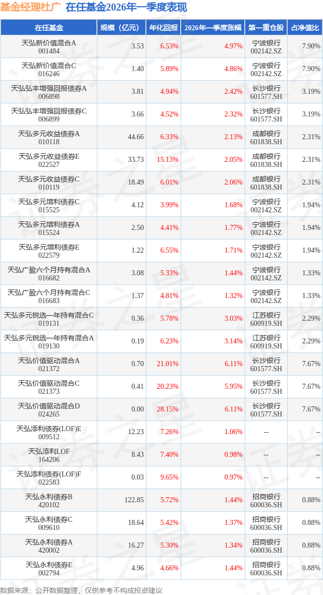 证券之星消息,日前天弘价值驱动混合C基金公布一季报,2026年一季度最新规模0.41亿元,季度净值涨幅为5.95%。