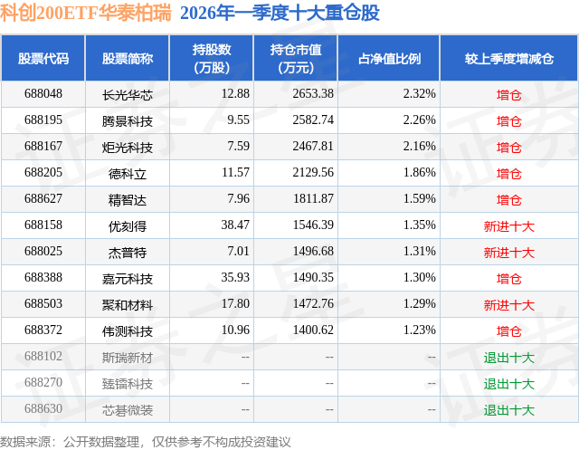 从基金规模来看,科创200ETF华泰柏瑞基金2026年一季度公布的基金规模为11.43亿元,较上一期规模5.25亿元变化了6.18亿元,环比变化了117.67%。该基金最新一期资产配置为:股票占净值比98.97%,无债券类资产,现金占净值比1.12%。从基金持仓来看,该基金当季前十大股票仓位达16.67%,第一大重仓股为长光华芯(688048),持仓占比为2.32%。