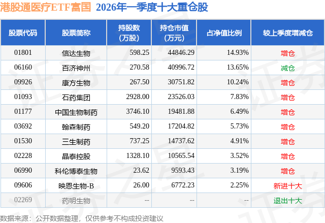 从基金规模来看,港股通医疗ETF富国基金2026年一季度公布的基金规模为30.04亿元,较上一期规模31.38亿元变化了-1.34亿元,环比变化了-4.26%。该基金最新一期资产配置为:股票占净值比99.69%,无债券类资产,现金占净值比0.51%。从基金持仓来看,该基金当季前十大股票仓位达72.74%,第一大重仓股为信达生物(01801),持仓占比为14.93%。