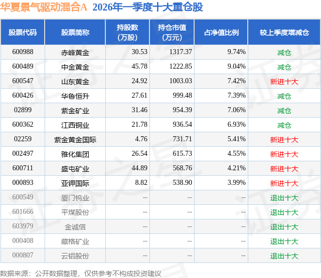 从基金规模来看,华夏景气驱动混合A基金2026年一季度公布的基金规模为1.14亿元,较上一期规模2.68亿元变化了-1.53亿元,环比变化了-57.31%。该基金最新一期资产配置为:股票占净值比87.38%,无债券类资产,现金占净值比12.39%。从基金持仓来看,该基金当季前十大股票仓位达65.74%,第一大重仓股为赤峰黄金(600988),持仓占比为9.74%。